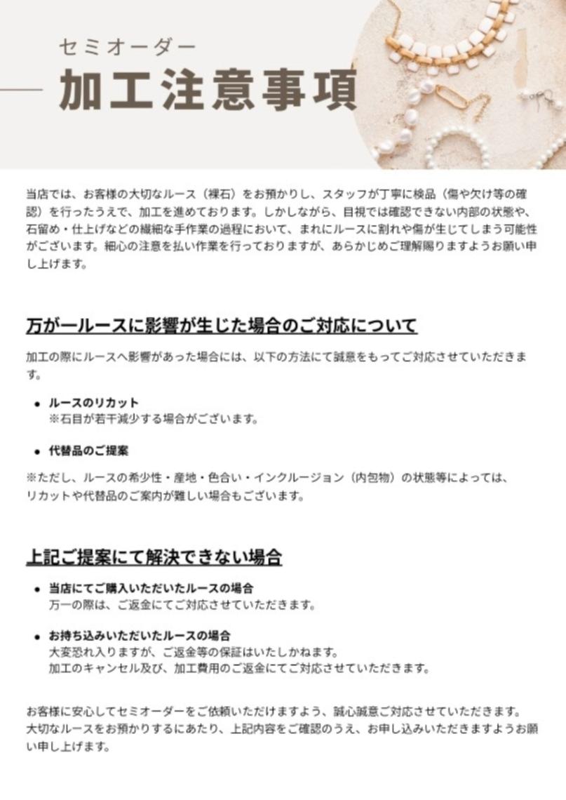 加工には細心の注意を払いますが、職人様の手作業の為、ルースが割れてしまう、キズ付けてしまうなどのリスクもございますので予めご理解とご了承を下さい。